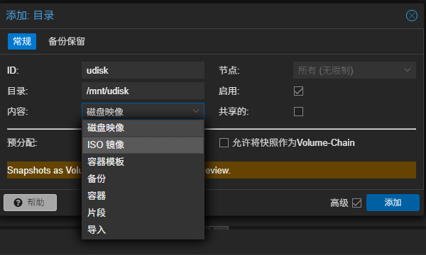 ID输入 udisk,目录输入 /mnt/udisk ,内容选磁盘映像、ISO镜像,如磁盘同时用来作为备份磁盘可再选上备份。