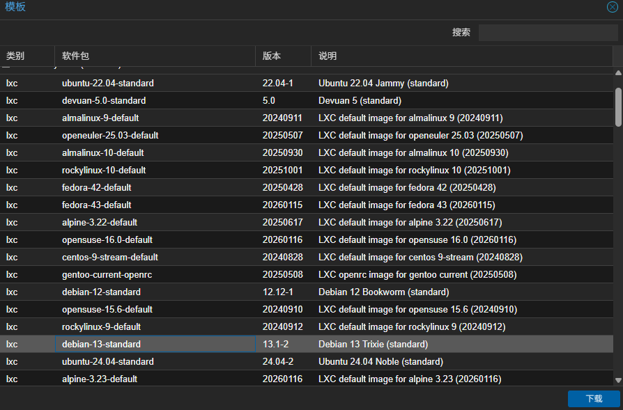 为 lxc 容器选择适合的模板。点击 pve 节点,CT模板>模板,在列表中选择 debain-13-standard,当然也可选择熟悉的其他模板下载。