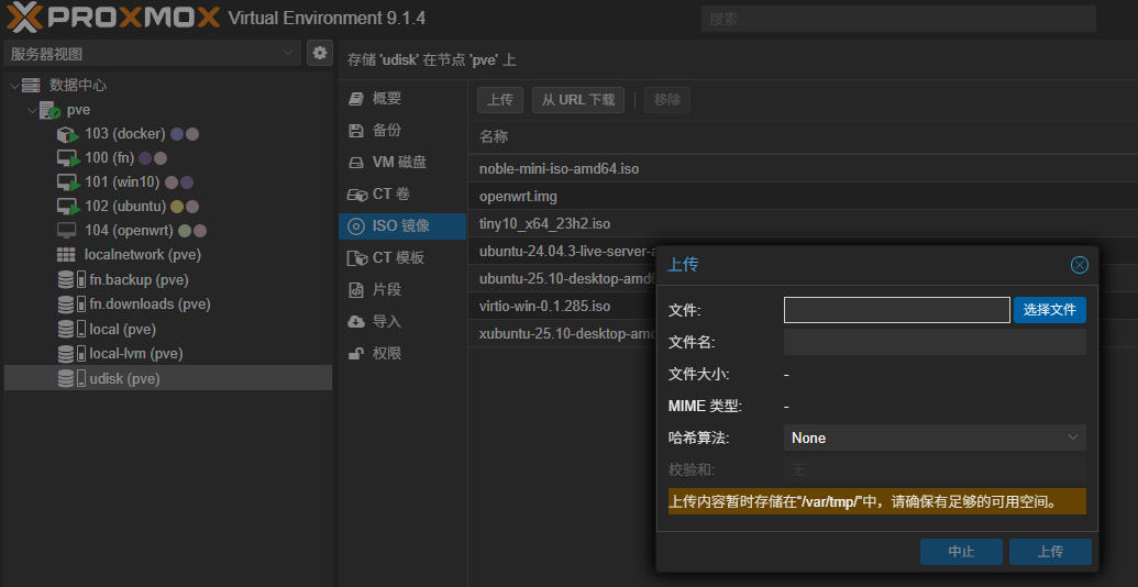 左侧 pve 节点下选择 udisk,ISO镜像>上传,即可上传将要安装的虚拟机系统镜像,如 飞牛、windows、ubuntu。上传后的镜像位置为 /mnt/udisk/template/iso/