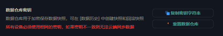 点击右上角设置 → 关于,找到 数据仓库密钥,选择导入密钥,然后输入你之前在 Docker 端初始化时记下的那串字符。确保两端密钥完全一致,否则无法解密数据。