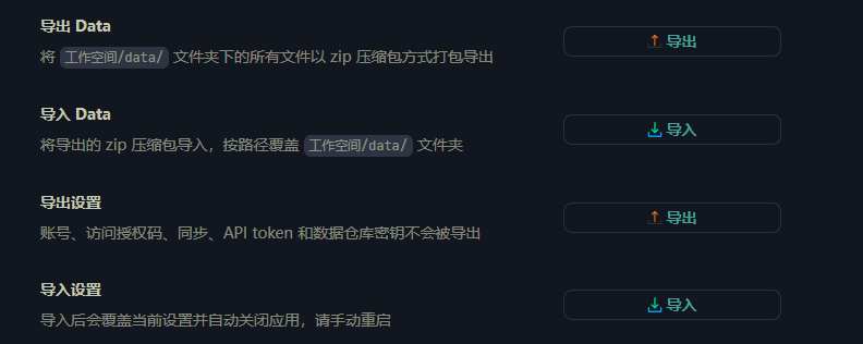 养成良好的定期备份习惯,设置 → 导出 中将 Data 和 设置导出本地备份。
