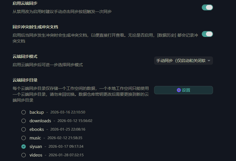 点击云端同步目录右侧 设置,选择 webdav 共享中的一个目录用于存储同步数据。