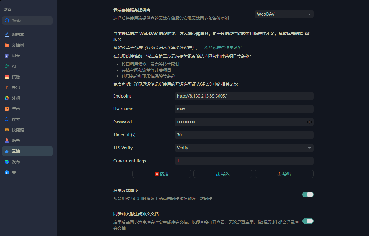 回到设置 → 云端,与 Docker 端同样配置好 webdav 服务器。